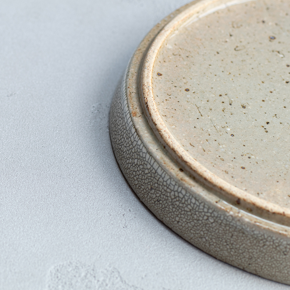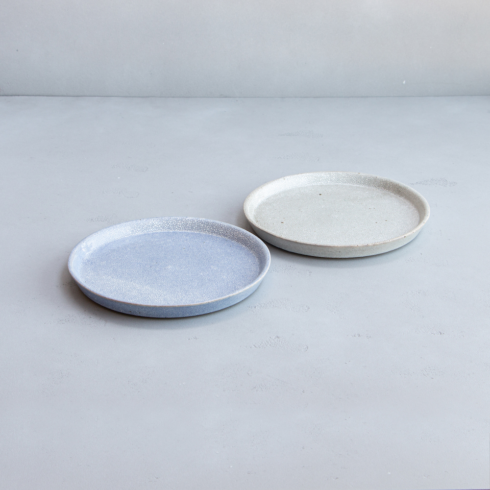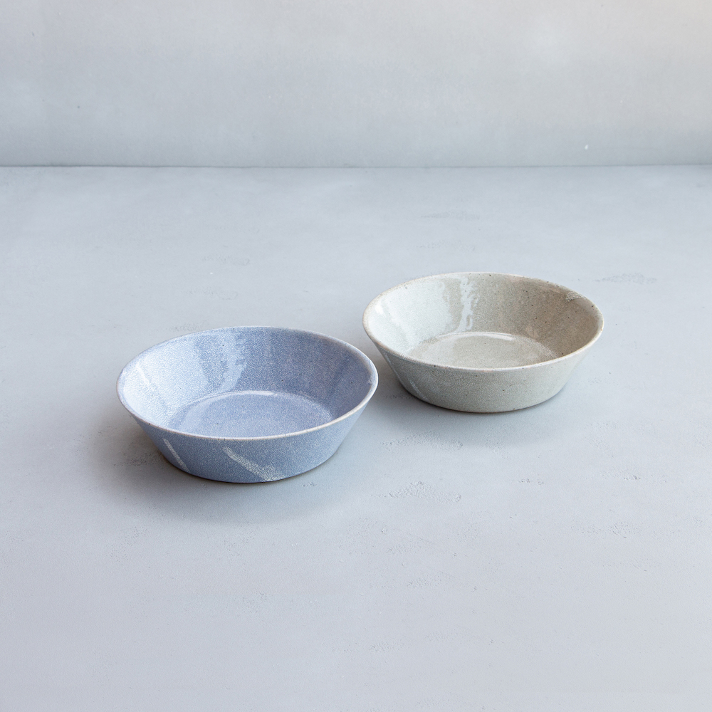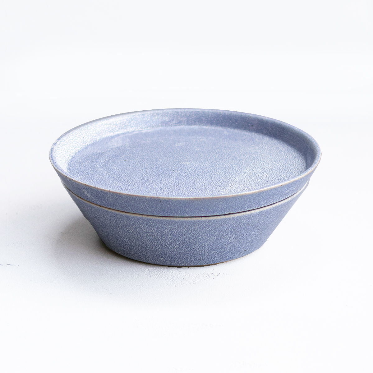 The finely designed angle of the high base enables beautiful stacking, allowing different shapes and identical items to be smartly stacked. The plates can also be used as lids, quickly transforming into storage containers. Each piece of kasane’s dishes is designed to be lean in size, suitable for various daily menus. The unique texture, called Kairagi is made of highly rare clay, resulting in a glossy color pattern with a three-dimensional effect. A set of a plate and a bowl.