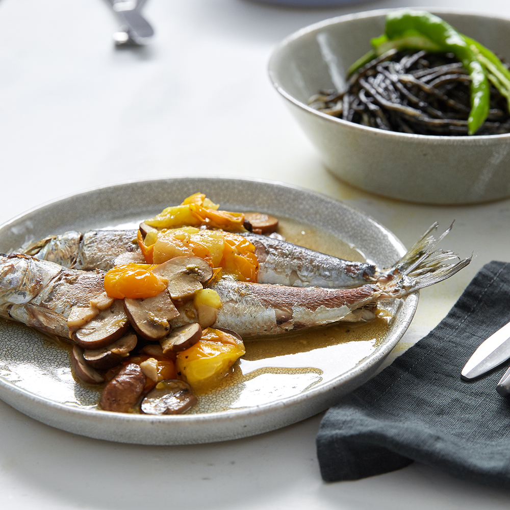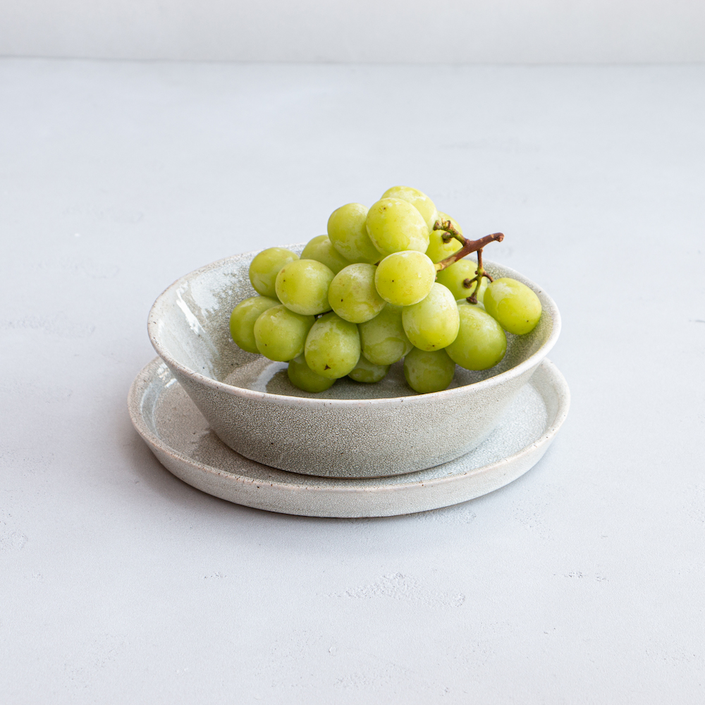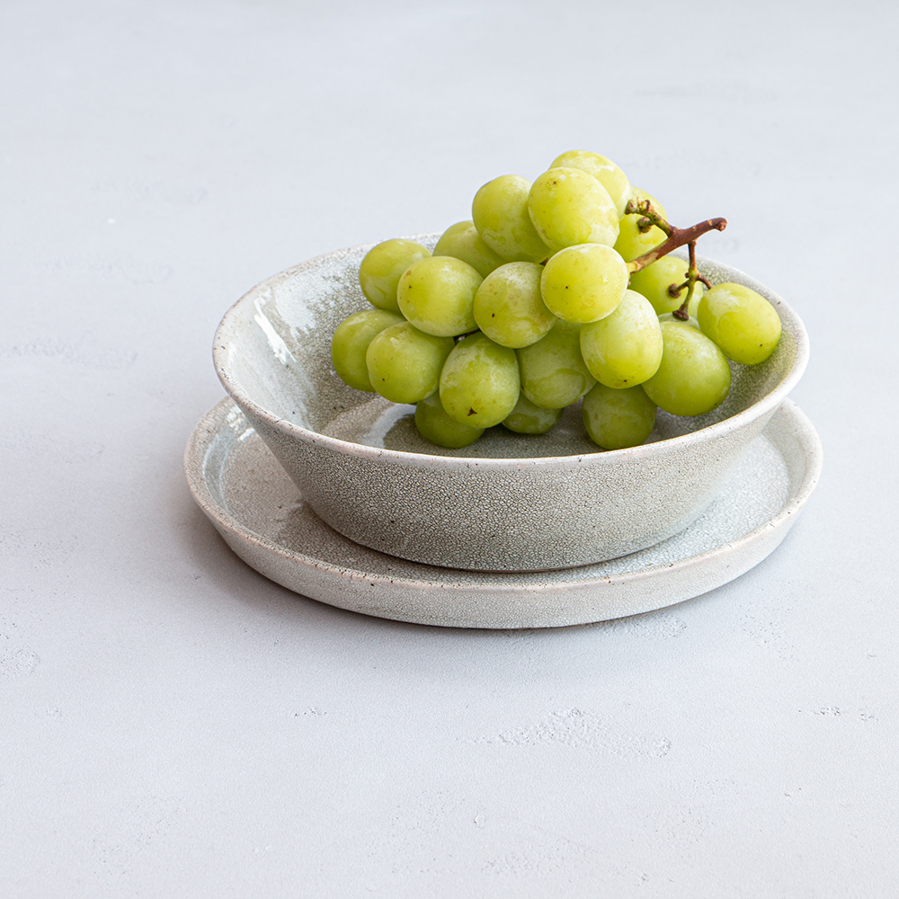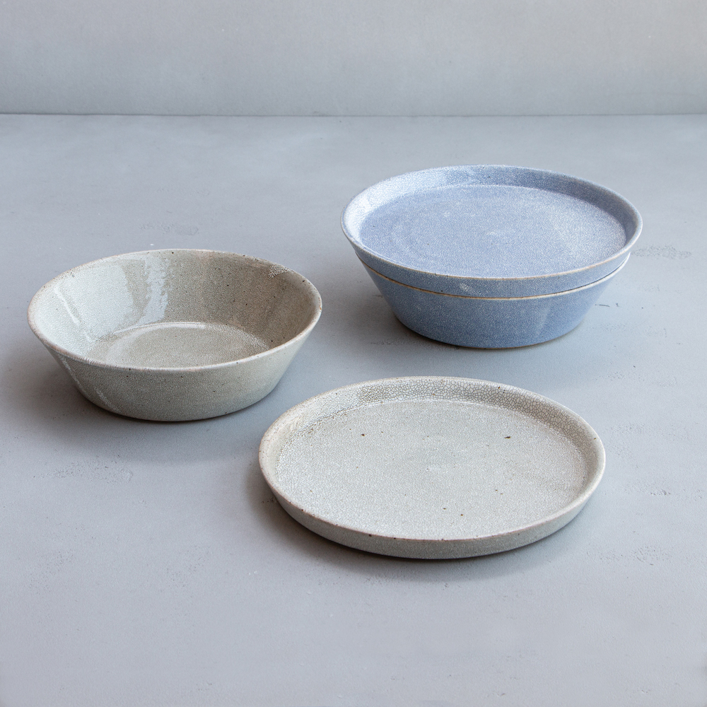 The finely designed angle of the high base enables beautiful stacking, allowing different shapes and identical items to be smartly stacked. The plates can also be used as lids, quickly transforming into storage containers. Each piece of kasane’s dishes is designed to be lean in size, suitable for various daily menus. The unique texture, called Kairagi is made of highly rare clay, resulting in a glossy color pattern with a three-dimensional effect. A set of a plate and a bowl.