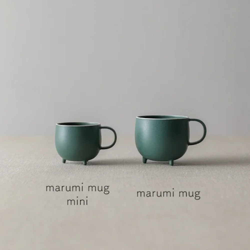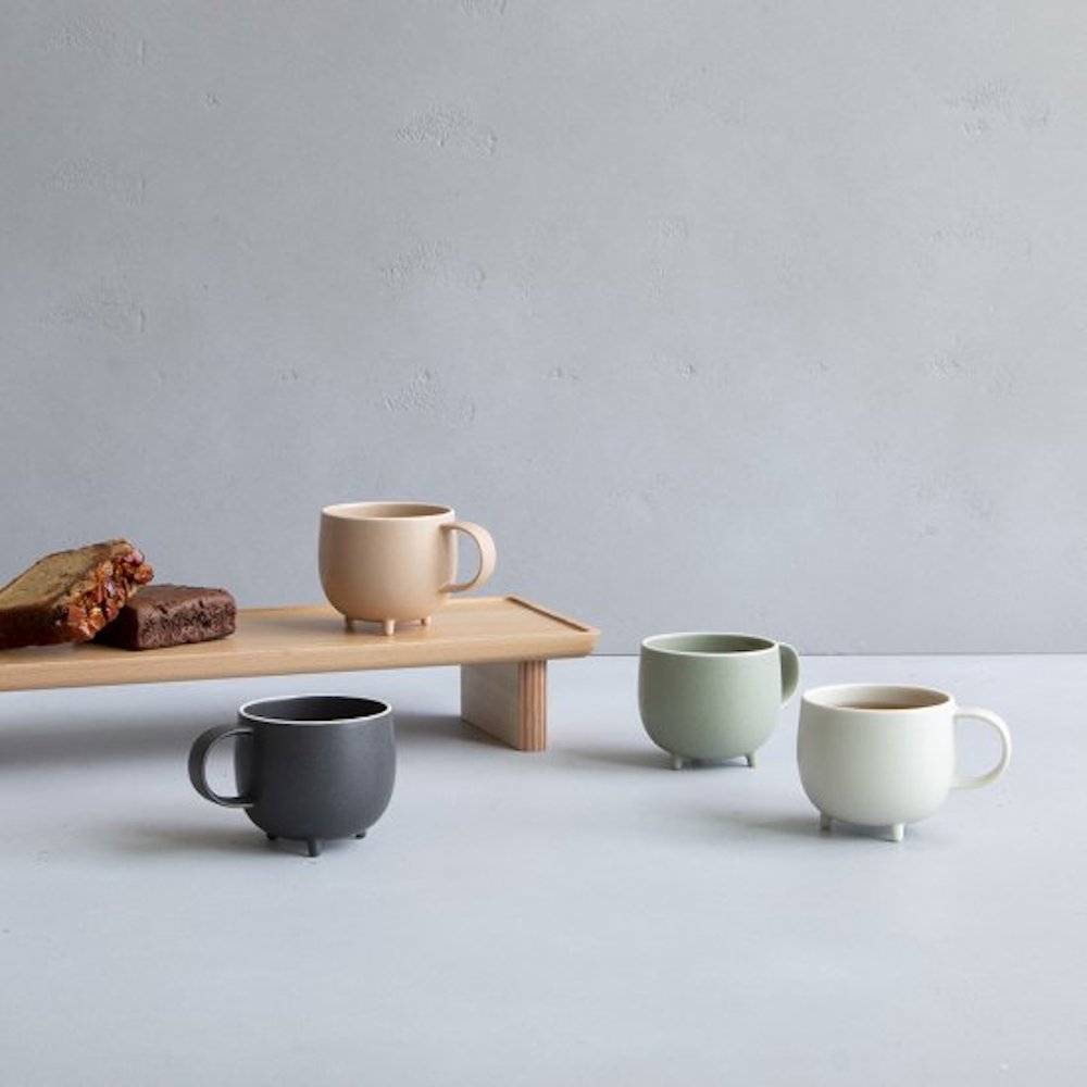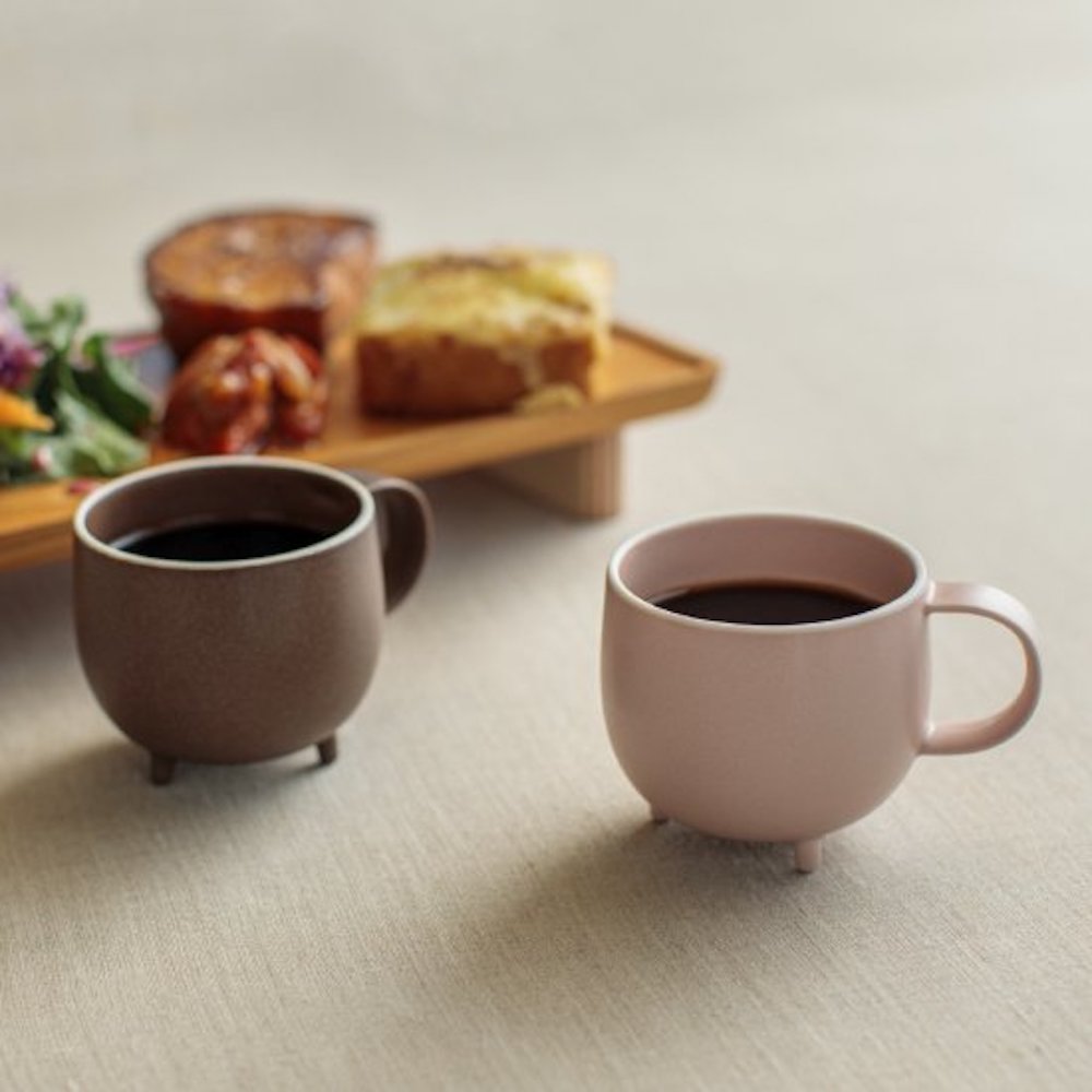Crafted seamlessly using the gaba casting method, this mug boasts an iconic appearance that seems ready to come to life at any moment. Its plump round cup, three supporting legs, and tail-like handle are all molded as one piece. The three-dimensionally round bottom facilitates effortless mixing, making it ideal for blending milk into coffee without the need for a muddler. Developed from scratch, the glaze highlights the mug’s form while maintaining its round shape through careful firing.