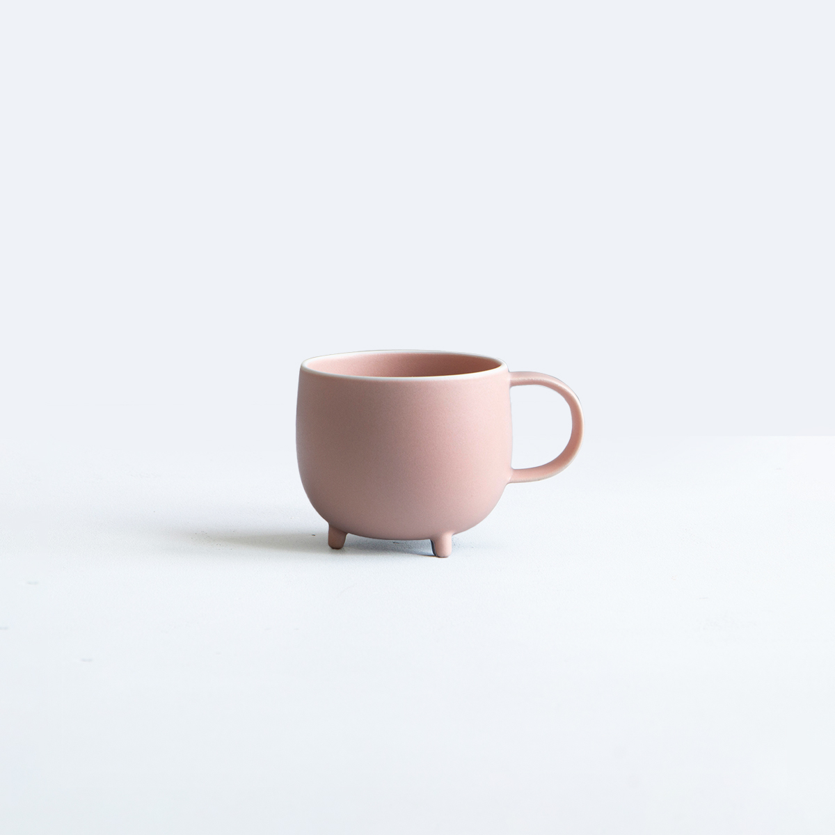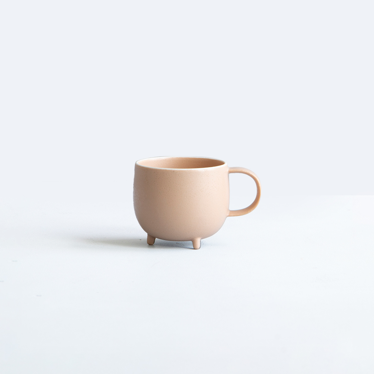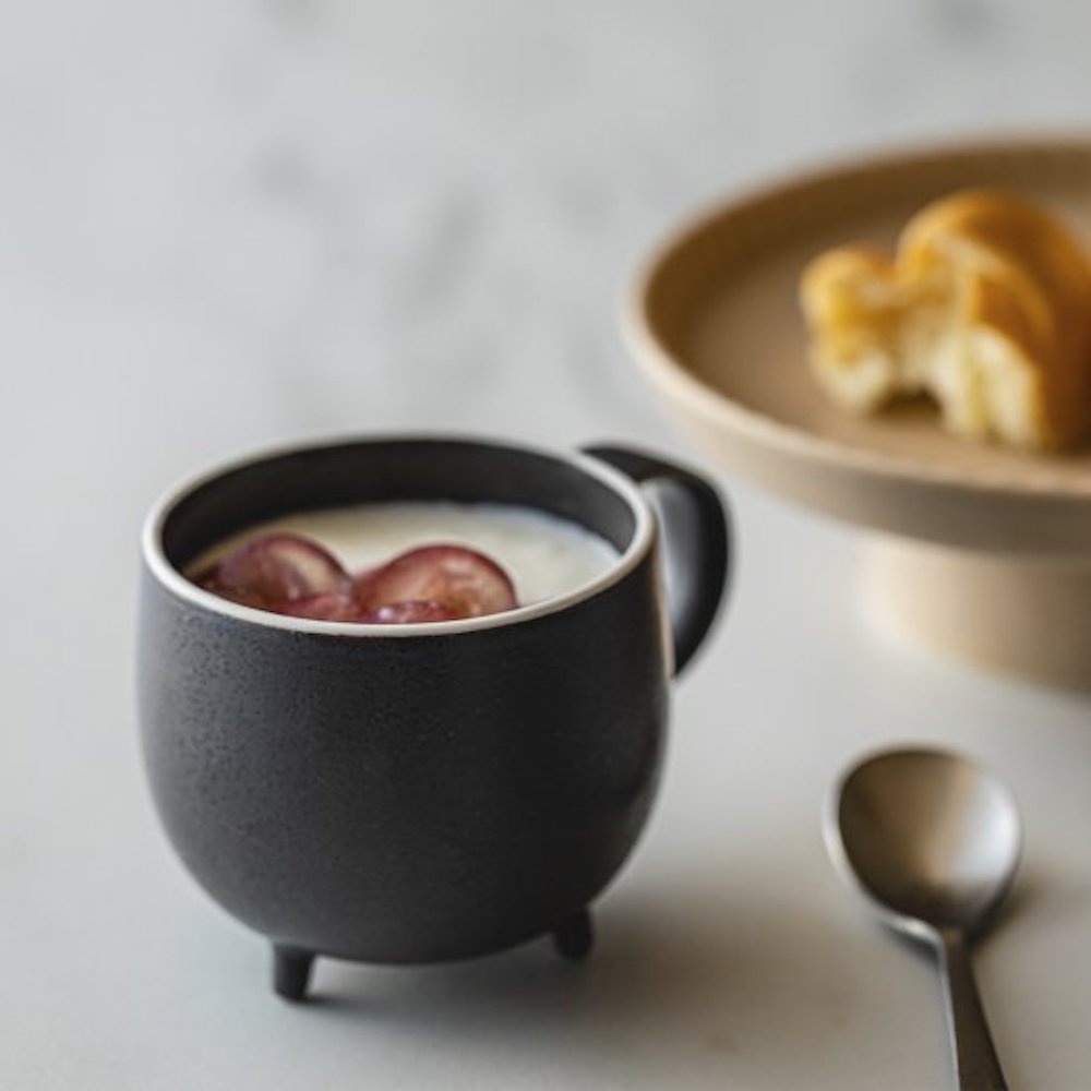Crafted seamlessly using the gaba casting method, this mug boasts an iconic appearance that seems ready to come to life at any moment. Its plump round cup, three supporting legs, and tail-like handle are all molded as one piece. The three-dimensionally round bottom facilitates effortless mixing, making it ideal for blending milk into coffee without the need for a muddler. Developed from scratch, the glaze highlights the mug’s form while maintaining its round shape through careful firing.